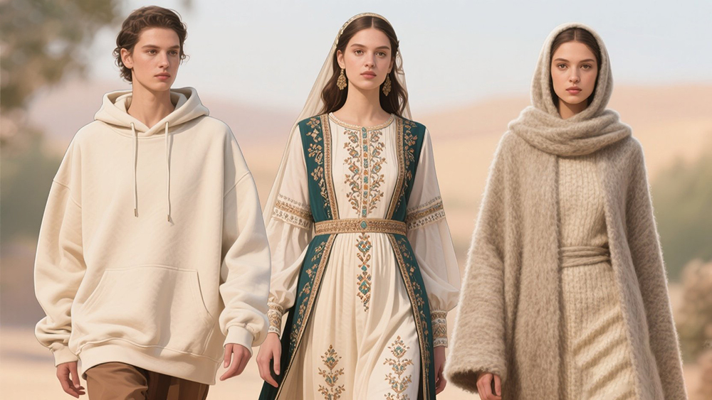 The first set was a Western-style oversized hoodie made of soft cotton fabric, simple yet stylish, perfect for everyday wear. The second was a custom dress that combined traditional Middle Eastern elements, featuring intricate embroidery and unique fabrics, suitable for both formal occasions and modern flair. The third set was a robe with ethnic features, made from high-quality wool, ideal for various festive and religious events, maintaining traditional beauty with a modern twist.