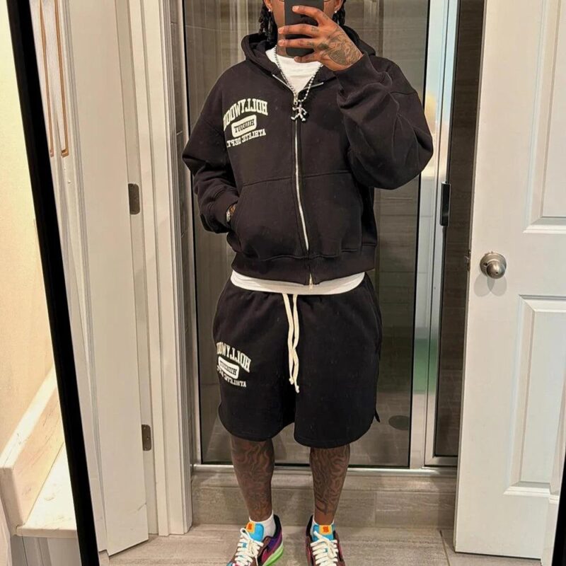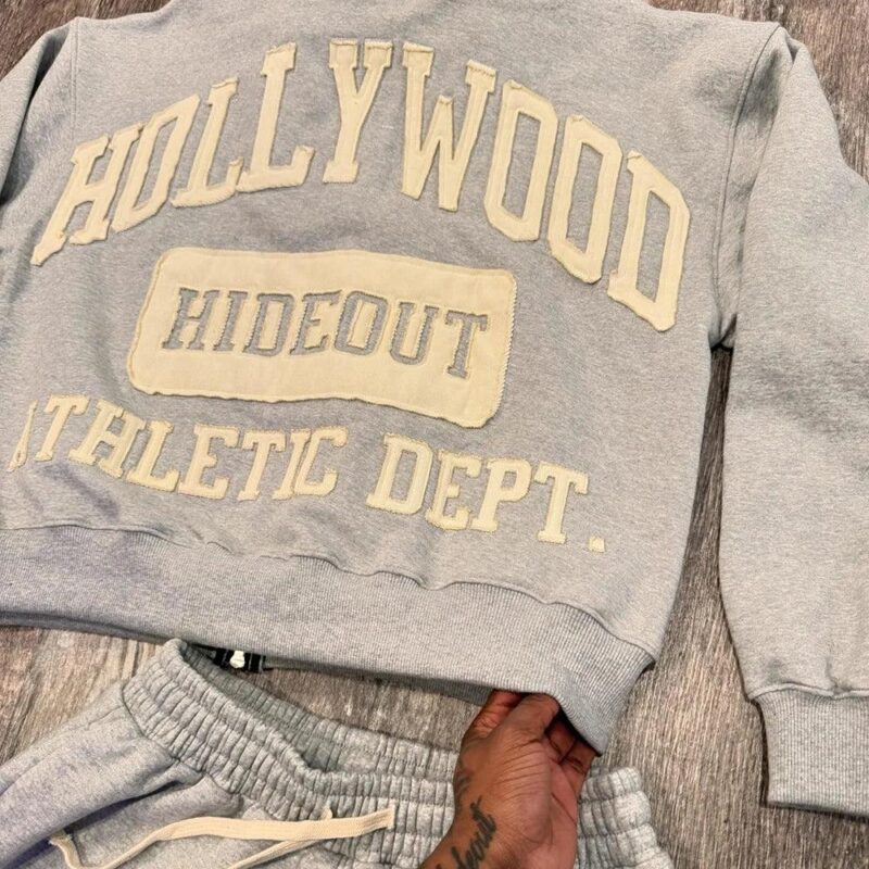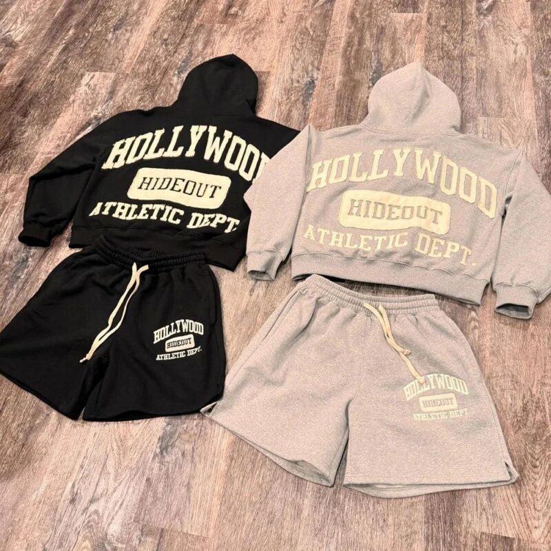 Design: The hoodie has "HOLLYWOOD HIDEOUT ATHLETIC DEPT." printed on the back, and the shorts also feature the brand logo, offering a simple and elegant design.