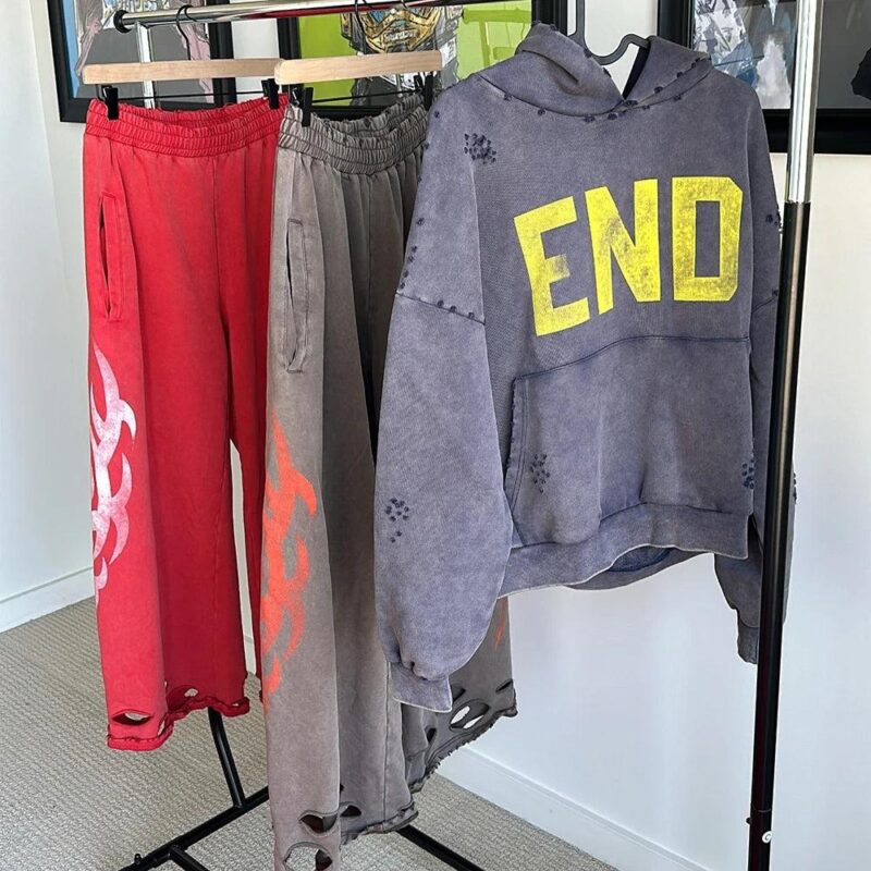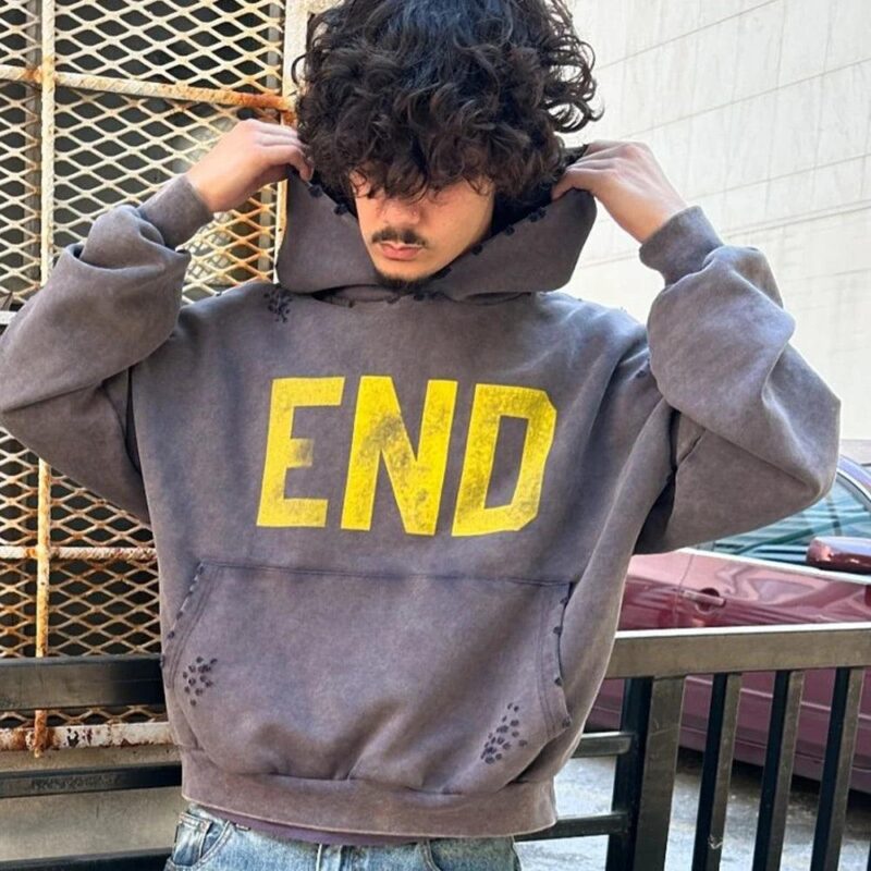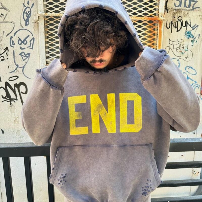 Design: Large "END" print on the chest, complemented by frayed edges and rips, showcasing street style.
