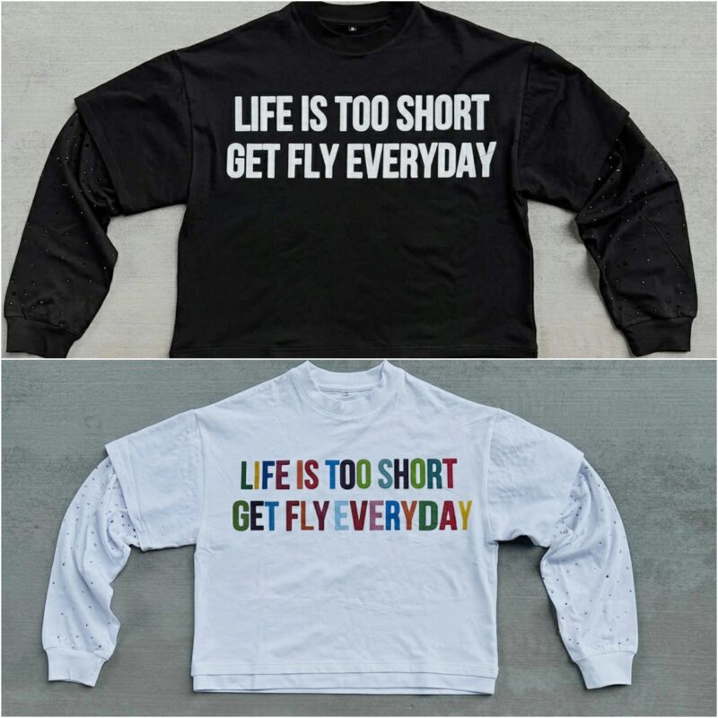 Design: The front features a colorful slogan "LIFE IS TOO SHORT GET FLYE EVERYDAY," conveying a positive attitude towards life.