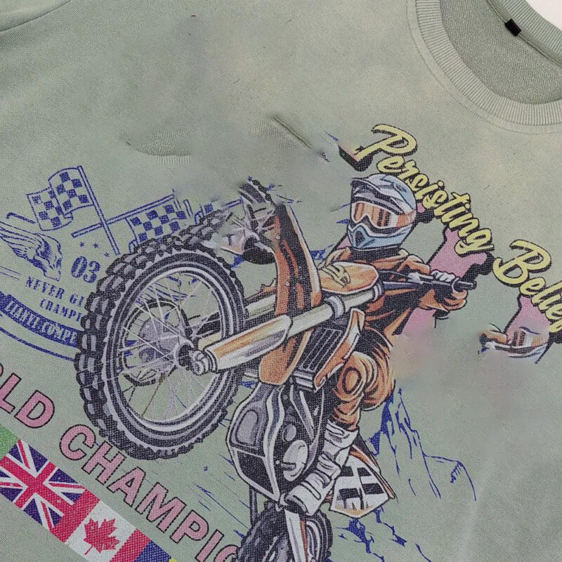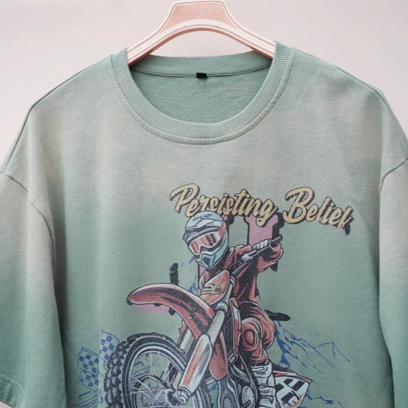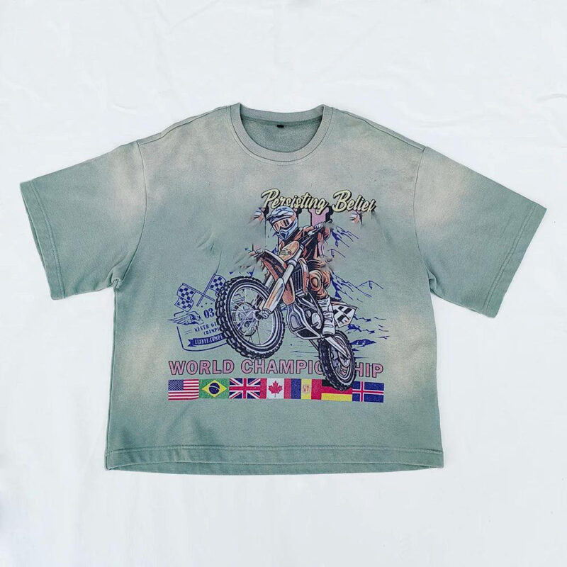 Design: Unique retro motorcycle pattern combined with "Persistent Belief" and "World Championship" slogans, showcasing personality and fashion.