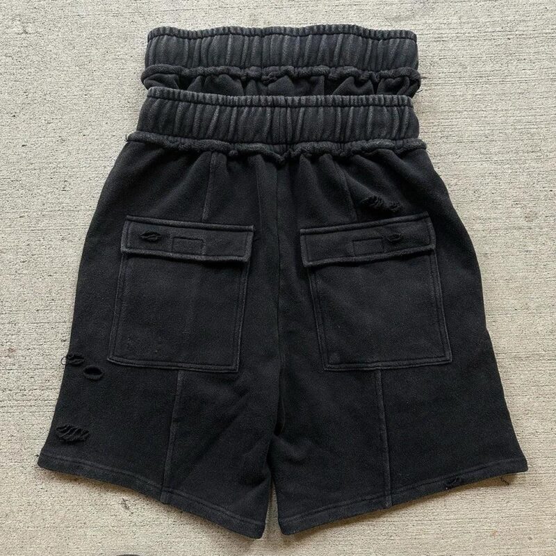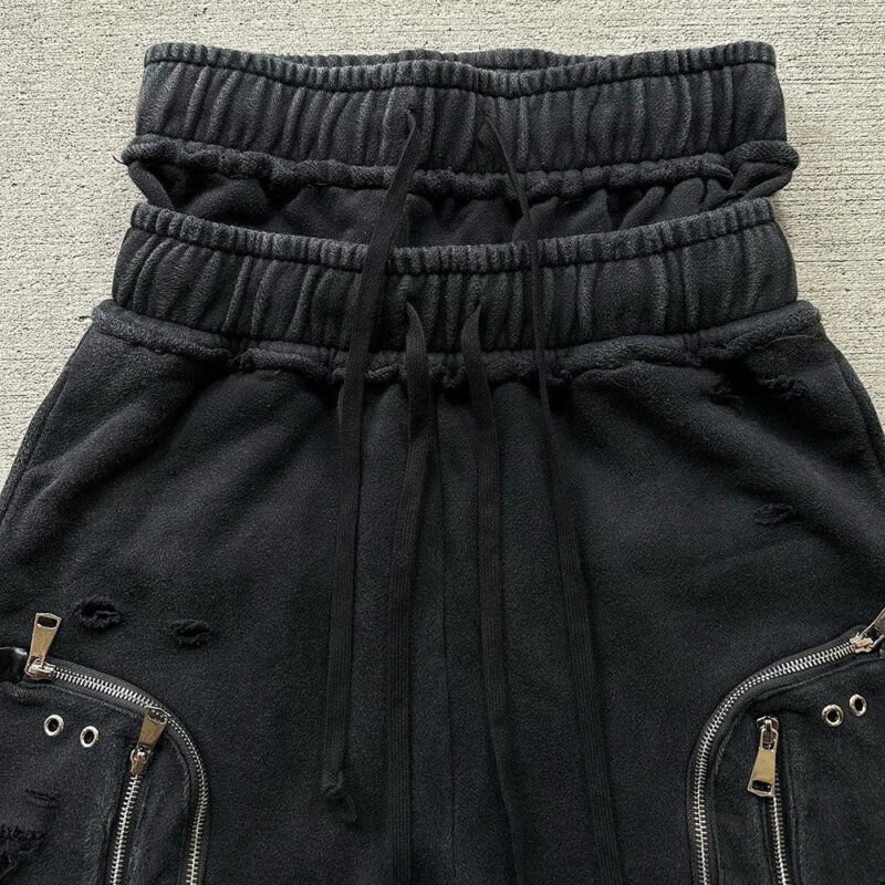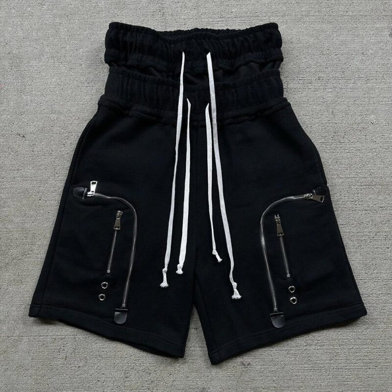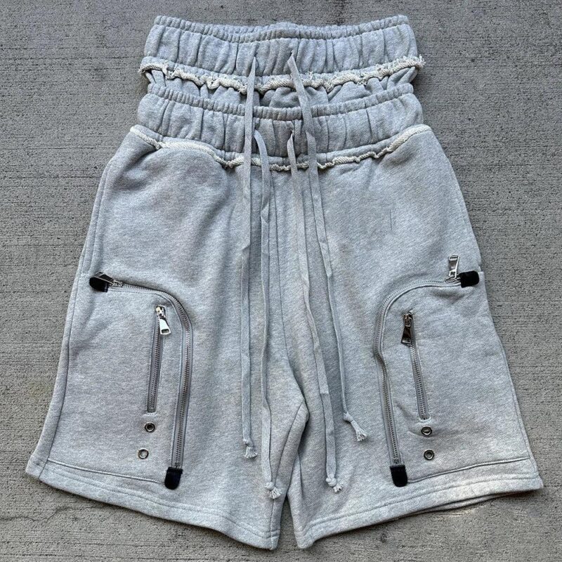 Design: The shorts are printed with unique patterns, complemented by zippers and beaded decorations, showcasing a fashionable street style.