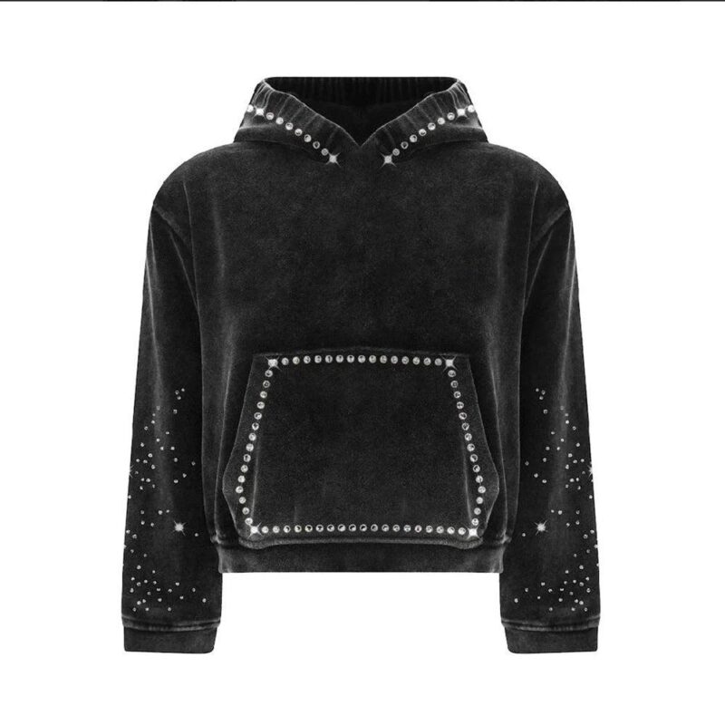 Design: Rhinestone designs on the chest and sleeves, combined with unique text patterns, showcasing a blend of fashion and personality.