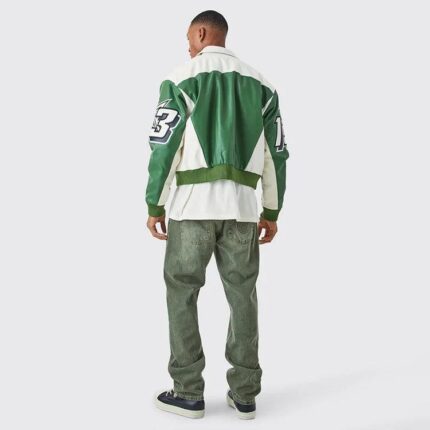 Xinyuan Men’s Jacket Racing Style, Custom Patchwork Letter Embroidery Moto PU Leather Bomber Jacket with Boxy Fit